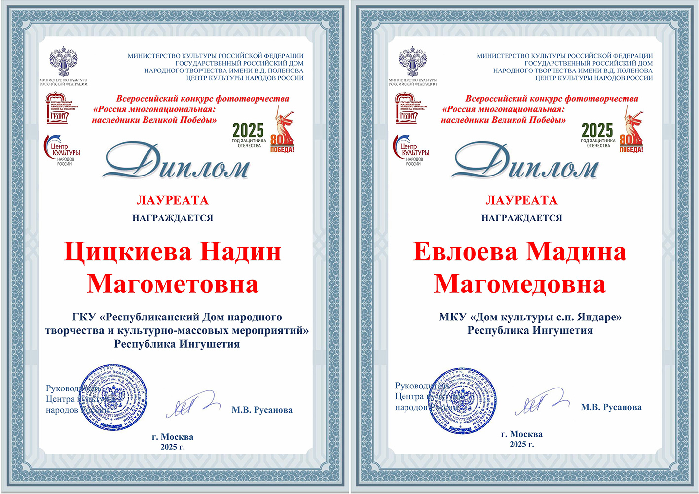 В России подвели итоги масштабного конкурса фототворчества «Россия многонациональная: наследники Великой Победы», инициированного Центром культуры народов России Государственного Российского Дома народного творчества им. В. Д. Поленова. Конкурс стал яркой площадкой для сохранения исторической памяти и демонстрации культурного многообразия нашей страны через призму фотоискусства. В число лауреатов конкурса вошли талантливые представительницы Ингушетии Надин Цицкиева и Мадина Евлоева.